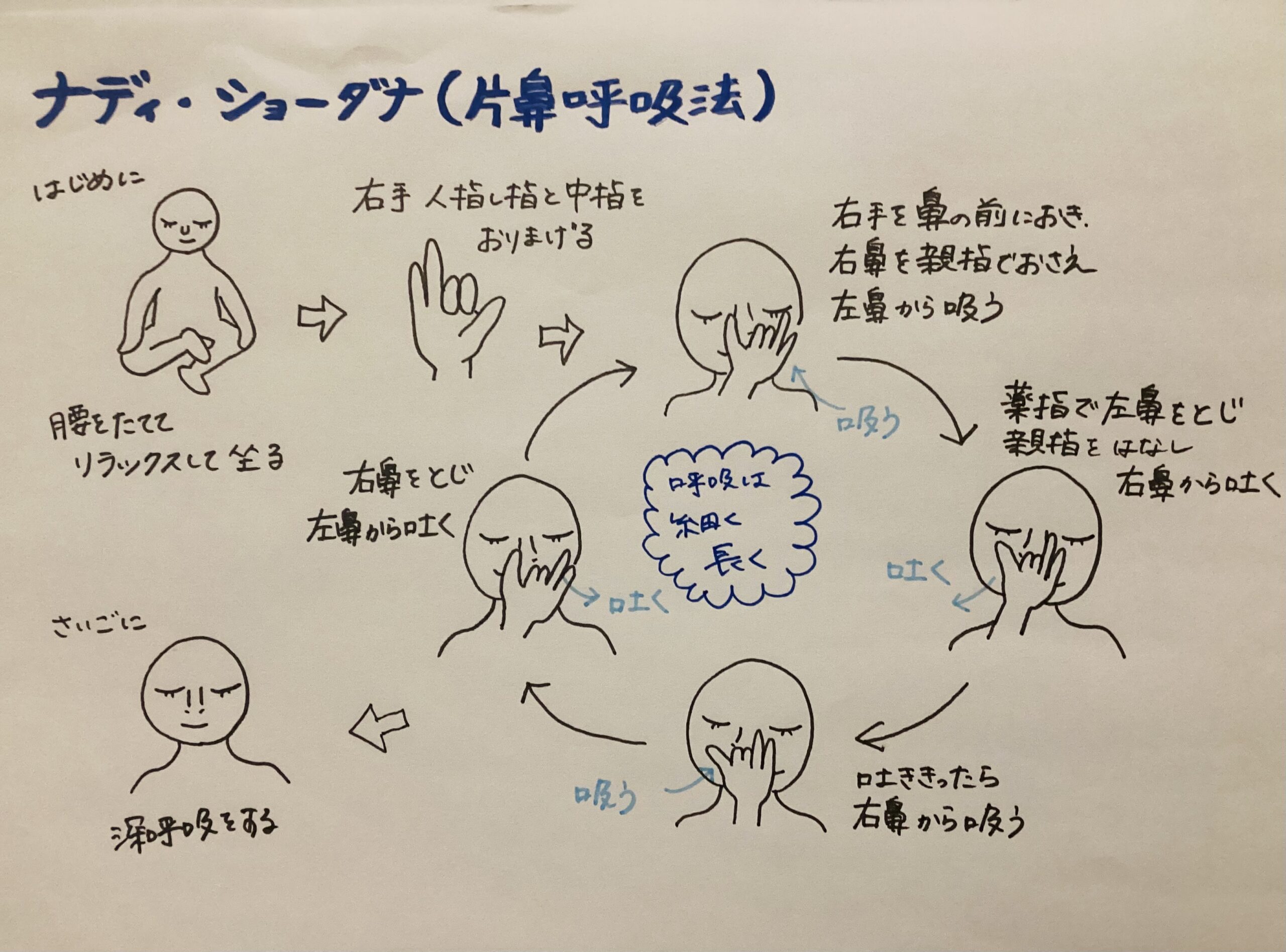 ヨガでは、ナディは『気(プラーナ)の通り道』、ショーダナは『浄化する』という意味があり、『気の通り道を浄化する』呼吸法です。